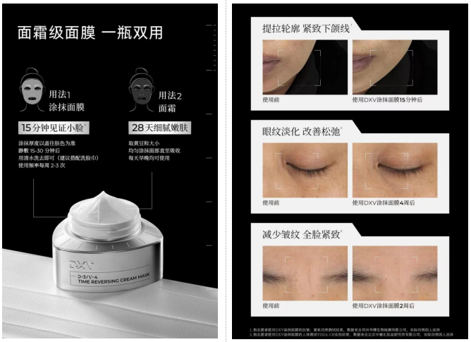 据公开数据显示,近年来中国抗衰老市场需求呈高增长趋势,现代人不健康的作息、不良坐姿卧姿、电子产品的使用等都加剧了肌肤衰老问题的产生。其中在抗老化细分需求中,“紧致”功效的声量是最高的,其次是“提升”以及“淡化细纹”。在深入洞察消费者抗衰需求后,DXV定效维以“真正有效的功效护肤”为目标,聚焦“靶向抗衰”发布了首款单品——御时逆维霜态面膜,为消费者提供精准多维抗老功效。因其强大的即时提拉紧致能力,也被消费者称为“小脸面膜”。