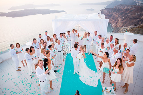 随后,他们携欧洲亲朋好友一同前往希腊进行了为期3天的庆祝,拥有湛蓝海洋和纯净白色建筑的圣托里尼成为了他们第二场庆典的目的地。