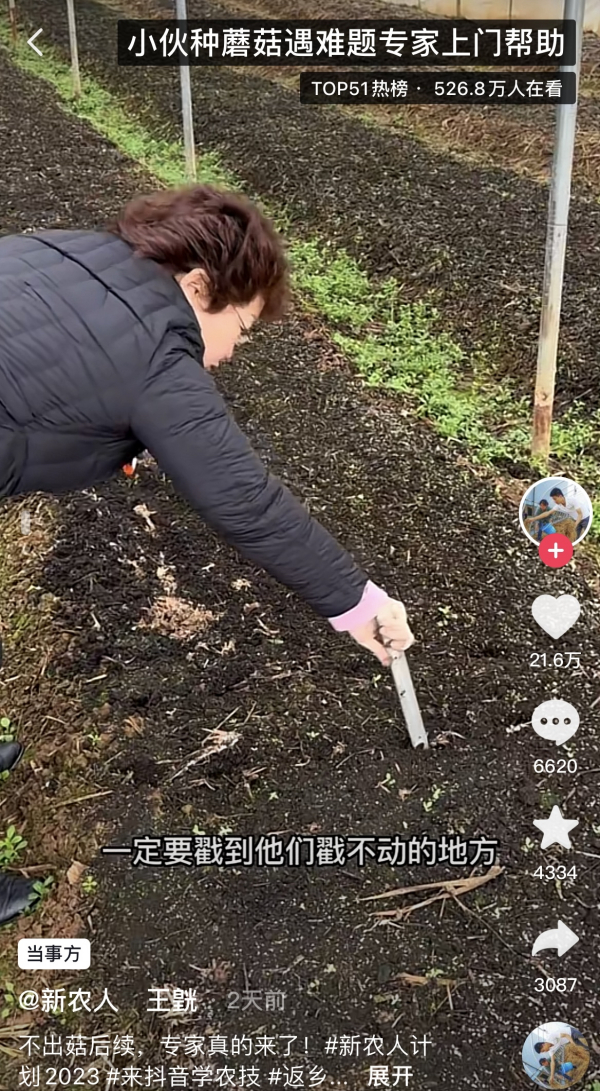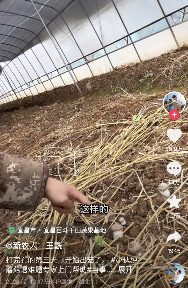 有了专家的指导,王皝第一时间在菌床上进行了打孔,并对大棚进行了通风。他把刘世玲教给自己的方法拍成了短视频,分享给更多农户,同时回应大家对菌菇生长的关心。截至目前,这条短视频已经获得35万的点赞。有网友说,看王皝最近的几条视频,就像是追更一个创业故事:第一集面对问题,第二集解决问题,第三集放下问题。