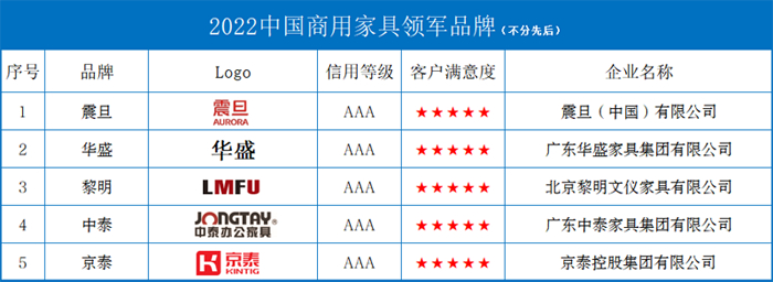 由招投标供应链品牌推介平台每年度定期举办的“2022中国办公及商用家具评价推介”活动,受到社会各界广泛关注与企业大力支持,并由来自质检、认证、环保、行业协会等专家对300多家知名品牌进行了综合评审,通过层层选拔,甄选出一批产品质量基础过硬,品质卓越、特色鲜明,在行业知名度高、影响力强,在消费市场与招投标市场表现突出、成绩优异的“2022中国商用家具领军品牌”供应商,加以大力宣传、推介、传播,树立“中国品牌”标杆,展示企业良好形象,发挥品牌的引领带动作用,以点带面驱动商用家具鏖战新未来!“2022中国商用家具领军品牌”名单具体如下: