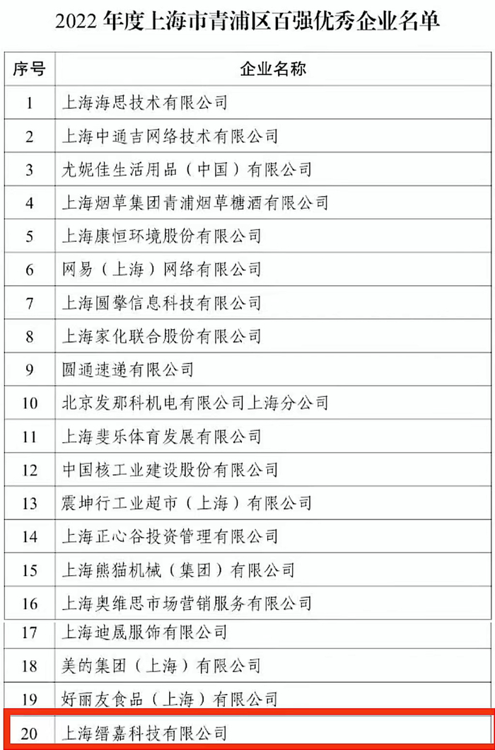 “2022年度青浦区百强优秀企业”榜单揭晓,上海缙嘉名列20位