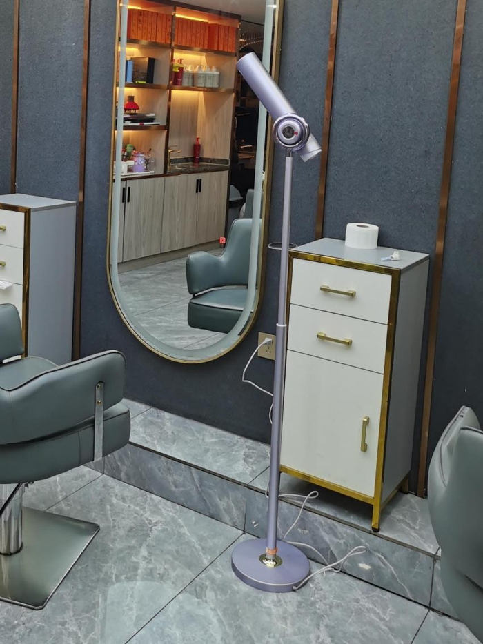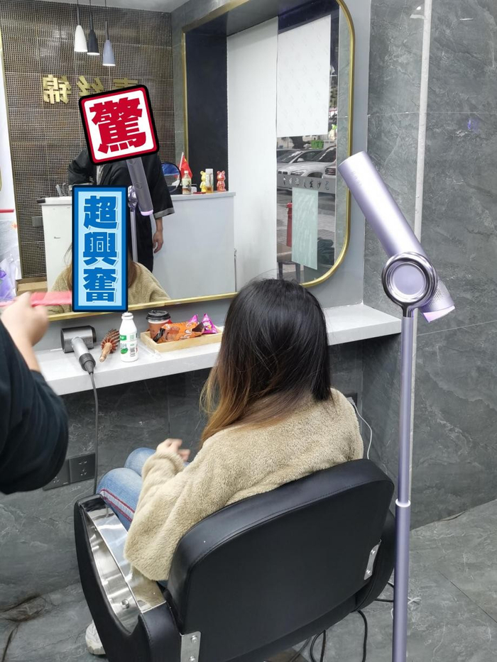 我们都天真了,其实它是一台吹风机!!!是一台很少见的落地式吹风机,主打免手持设计,强调解放双手吹头发,这不就是新一代懒人之光——解放女生的吹发神器吗!就在这时,小编注意到店里的tony小哥准备拿给一位女生试用,爱凑热闹的小编连头发都不洗了,立刻围观,毕竟,长这么大还是第一次见这样的吹风机呢!