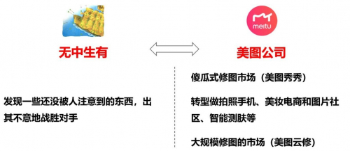 对应到上图的美图公司来说,它在不同的阶段中,从人无我有、人有我优地来发现价值,创造商机。下面总结了三个阶段来分析:
