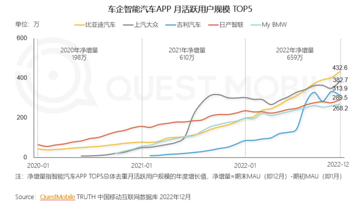 事实上,在场景应用上,“智能”、“互联”从手机向汽车终端、穿戴设备的延伸,并且,“高速互联”、“智能”,已经成了这些领域设备的“新卖点”,如,截止到2022年12月,智能汽车APP中,比亚迪汽车、上汽大众、吉利汽车、日产智联、My BMW月活用户规模分别达到432.6万、382.7万、313.9万、289.5万、268.2万。