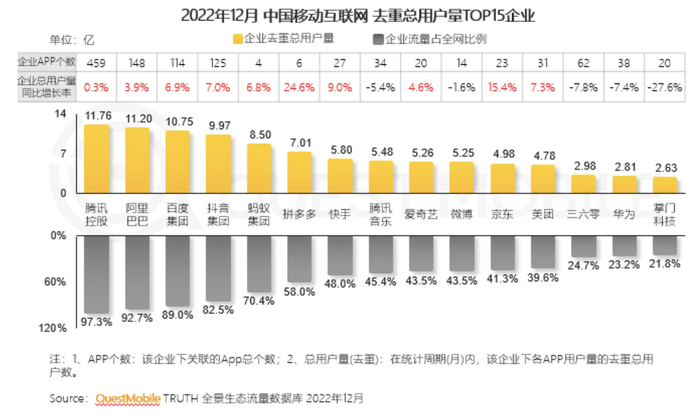 QuestMobile数据显示,短视频已经是用户时长占比最高的应用,总用户时长占比达到28.5%(2019年为15.2%),受此影响,即时通讯已经下降到了20.7%(2019年为26.5%)。具体到公司层面,老牌头部互联网公司如腾讯、阿里、百度去重用户总量分别为11.76亿、11.20亿、10.75亿,仍旧保持用户量优势。