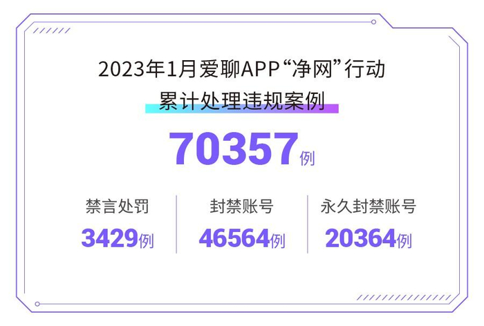 2023年1月,爱聊APP“净网”行动累计处理违规案例70357例,禁言处罚3429例,封禁账号46564例,永久封禁账号20364例。