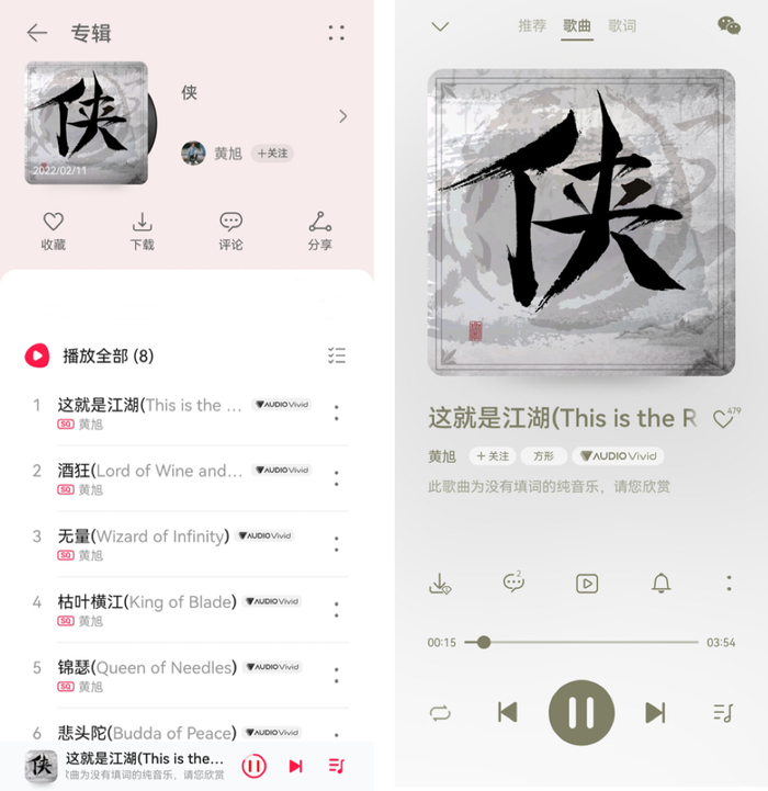 在首批上线华为音乐空间音频专区的作品中,资深空间音频制作人黄旭就他的武侠音乐专辑《侠》进行了独家创作心得分享,该专辑依托空间音频技术进行音乐叙事,通过在声音移动速度、方向与角度上的创意设计,来体现不同的人物形象以及构建出江湖世界的沉浸感,让听众仿佛置身于武打场景,听到一个喝醉酒的侠客敲打着各类乐器,剑法、气功、法术俱全。