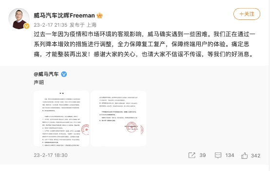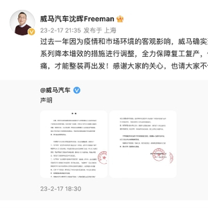 2月17日,威马官方对近期网络上所传言论进行了相关回应。