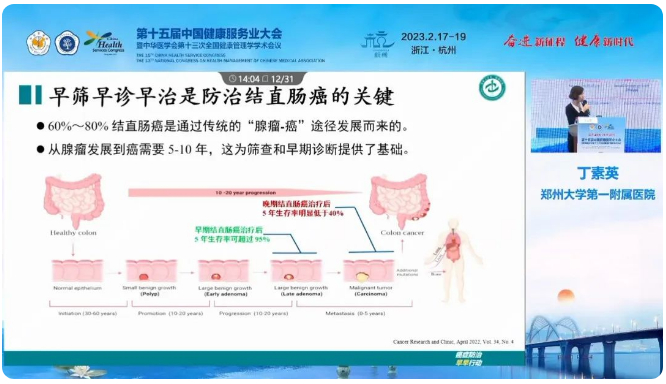 丁素英主任在报告中讲到,早筛早诊早治是防治结直肠癌的关键。目前中国结直肠癌发病率死亡率不容乐观,而筛查率、早期诊断率却很低,公众对结直肠癌及筛查的知识和重要性认知不足。结直肠癌从腺瘤发展到癌需要5-10年,这为筛查和早期诊断提供了时间窗口。