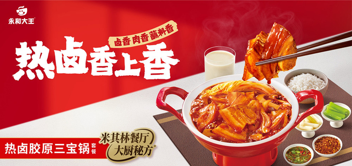 在经济逐渐复苏的当下,永和大王顺势而动、主动求新,在产品创新和门店创新上双管齐下。 “心级美味在大王”,作为中式快餐领导品牌,永和大王坚持将美味好餐和就餐的快乐带给更多顾客,不断创新发展新产品,打造美味营养的心级好餐。2023年开年推出的中华热卤系列全面上线,采用米其林餐厅大厨秘制香料,以金贵食材打造卤水醇香浓厚,臻选油脂香、肉香满满的优质食材烹饪“热卤三宝”。永和大王还创新卤味吃法,独家定制热卤小锅,让顾客享用到热气腾腾、鲜香粘糯的大王卤味,将心级美味融入日常每一刻。