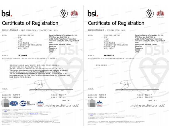 (店匠科技通过 ISO/IEC 27001、ISO/IEC 27701认证并获得证书)