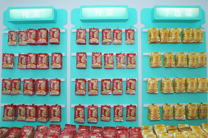 在产品陈列区,除了乌江轻盐榨菜外,乌江轻盐下饭菜、乌江轻盐下饭酱、乌江酸萝卜鱼调料等产品悉数其间,这是近年来涪陵榨菜集团“拓品类、拓市场”战略的重要成果。自去年开始,乌江品牌在“双拓”战略上动作不断,“以榨菜为原点,复合拓品类,跨界拓市场,进行矩阵式发展”,乌江先后推出了下饭菜、下饭酱、休闲零食、复合调味料等相关产品,不断满足现代消费者多元化的市场需求。乌江品牌正在从“榨菜代表”向“佐餐开味菜代表”进行升级,“大乌江”佐餐开味菜格局已初步成型。