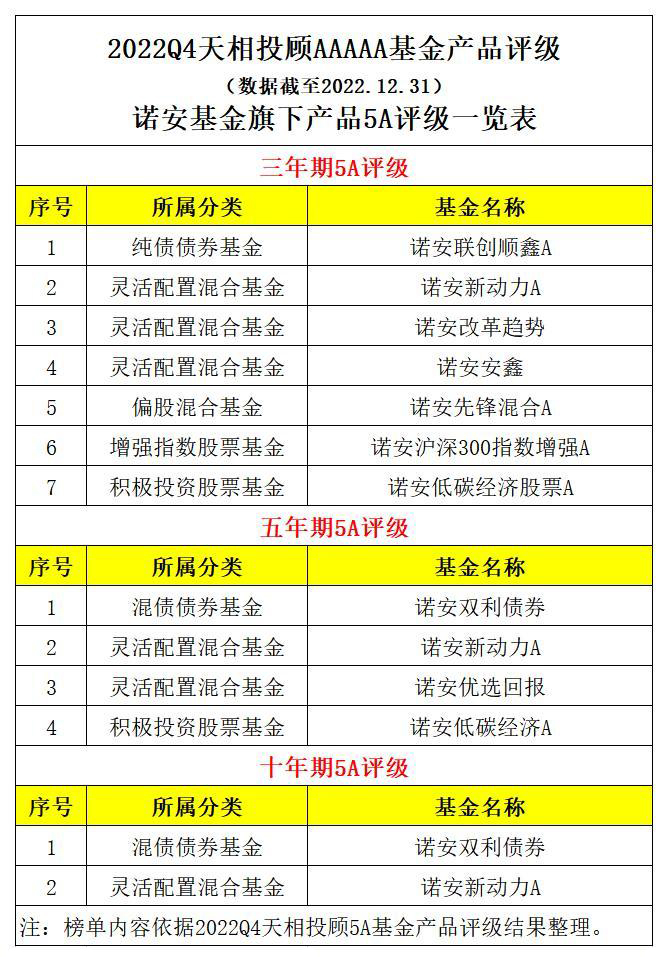 近日,天相投顾基金评价中心公布了2022年四季度最新评级结果。诺安基金为投资人交上了一份亮眼的成绩单,斩获“主动债券投资三年期5A评级”,与此同时,诺安旗下9只产品获天相5A评级,涵盖多个产品类型,展现出中长期不俗投资实力。(基金管理人评级来源:《2022Q4天相投顾AAAAA基金管理人评级结果》,评级日期:2023年2月1日,数据截至:2022年12月31日;基金评级来源:《2022Q4天相投顾AAAAA基金产品评级结果》,评级日期:2023年1月18日,数据截至:2022年12月31日)。