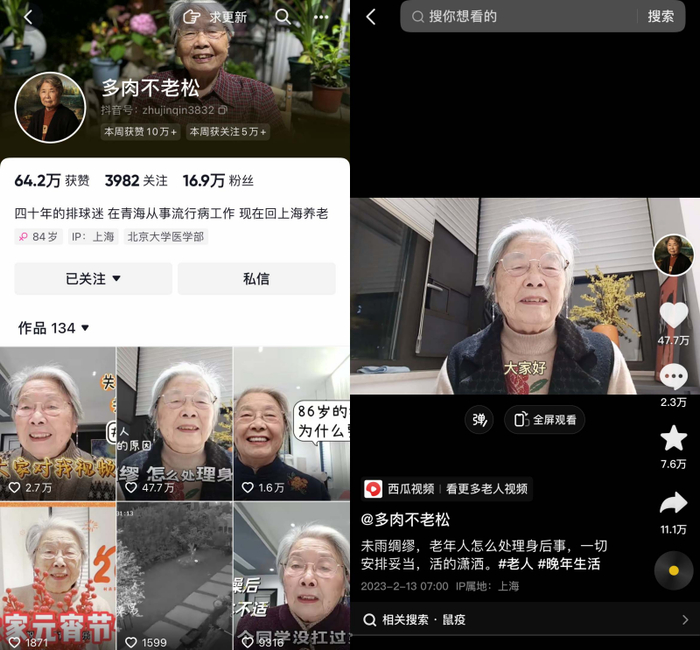 据了解,奶奶名为朱锦沁。去年7月,她开设抖音账号@多肉不老松 ,半年来已发布了134个视频,收获16.9万粉丝。据介绍,朱锦沁从零开始自学起步,从弄清剪辑叙事到斟酌有网感标题,逐渐玩转短视频平台。谈到为什么拍抖音,她表示,“本来是人家叫我写自传的,因为我经历得比较多,获得的荣誉也比较多。我说我不写,我这么大年纪了,没有心思写自传,还得去印刷。后来我女儿说,反正你会说,你就对着手机说就行了。我说那挺简单的,就试试吧。”