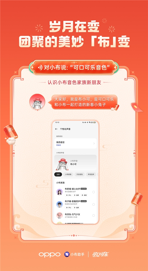 音色是智能助手人机交互中非常重要的一环,也是与用户沟通最自然高效的场景之一,为给用户更加多样与个性兼具的音色选择,春节期间,小布助手上线了一款可口可乐新春限定音色——「布小可」。在小布个性化声音设置页面,品牌定制音色拥有单独的曝光版位,以品牌LOGO融合新春兔子形象露出,吸引近百万用户点击选择「布小可」音色,用户能够听到“大家好,我是布小可,是可口可乐和小布打造的新春小兔子“的品牌口播植入。与布小可一样“甜美”的定制音色,是小布助手基于高表现力的趣味声音数据,采用端到端自适应合成技术语音建模而成。此外还采用了全新前端技术,让字准提升10%以上。