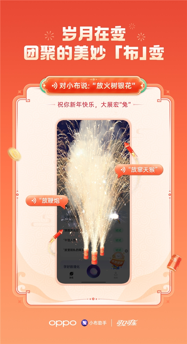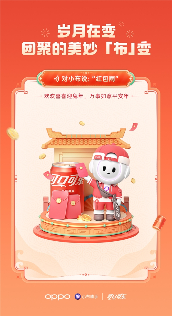 往年新春之际,聊天指令触发“放烟花”、“红包雨”,再到“迎财神”等新春互动玩法深受用户青睐,今年更是融合了“可口可乐”的专属年味,探索出小布助手2023年的新春新玩法。