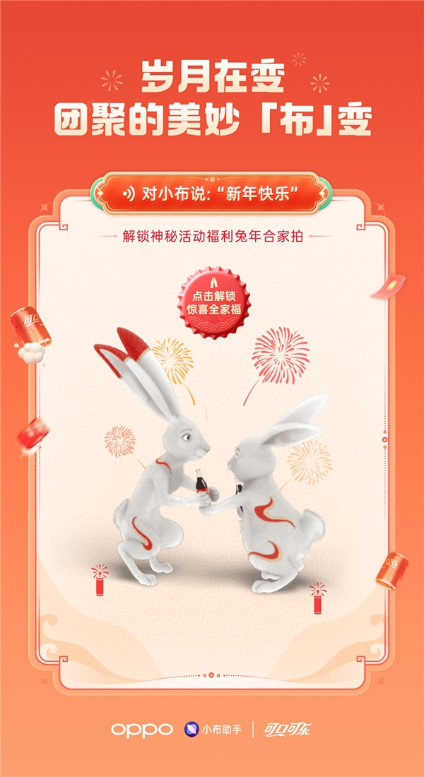 除了氛围打造与内容沟通,跨场景的流量引导,更成为本次新春合作的一大亮点,当用“新年好”、“兔年快乐”、“年夜饭”等新春高频指令唤醒小布时,兔年霸屏AI动画弹出。用户点击动画,即可一键跳转到APP端外的可口可乐小程序,参与小程序新春福利社版块的兔年合家拍活动,与异地好友家人实现云拍照。
