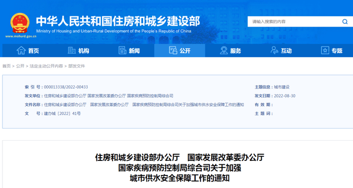 2022年,我国住房和城乡建设部办公厅、国家发展改革委办公厅、国家疾病预防控制局综合司在《关于加强城市供水保障工作的通知》中强调了要进一步提高供水监测与应急能力,加强供水水质检测,有效监测城区集中式供水、二次供水的卫生管理情况及供水水质情况,并开展供水卫生安全风险评估,以及时发现隐患,防范卫生安全风险。