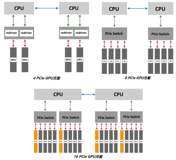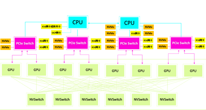 一些大型互联网公司还会使用自研GPU Box搭配计算节点的方式组建训练集群,GPU Box里面会搭载专用GPU模组或其他厂商的OAM模组。OAM(OAM, OCP Accelerator Module)是开源的GPU模块,由OCP社区服务器项目组下的OAI(OAI, Open Accelerator Infrastructure)小组开发并制定标准。