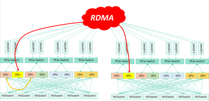 GPU在训练过程中会进行频繁通信,包括P2P通信(1对1)和Collective通信(1对多或多对多)。在节点内,GPU之间的通信互联带宽可达400GB/s。在节点之间,GPU通信使用RDMA网络,通过GDR(GDR, GPU Direct RDMA)技术支持, RDMA网卡可以绕过CPU、内存,直接从远端节点读取数据到GPU显存。