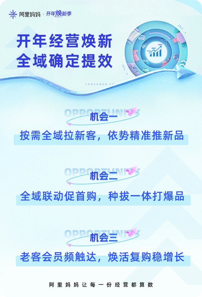 市场信心重振、经营回暖,消费在春季迎来焕新高潮。情人节、38大促是品牌蓄势起跑、抢占全年生意增量的黄金窗口。阿里妈妈洞察发现,新品贡献GMV占商家生意的30%;开年蓄力的新客可在618贡献60%的成交额,双11开门红2700家行业头部品牌成交额中50%以上来自会员。精准上新、新品引爆、新客提效、会员激活对于经营焕新、长效增长的重要性不言而喻。为抢占生意回暖经营焕新的先机,超级品牌们焕新经营思路,阿里妈妈推出开年焕新经营三大机会点,焕新节点全域提效,助力商家赢在春季经营的起跑线!