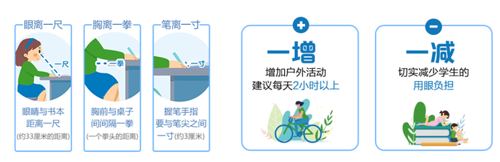 2. 帮助孩子养成科学用眼习惯:“20-20-20用眼法则”、“3个1”读写坐姿(眼离1尺、胸离1拳、笔离1寸)。