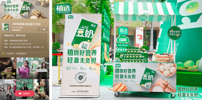 在2月6日至3月6日期间,伊利植选依托抖音生活服务平台,联名18家餐饮门店,将植选豆奶与本地门店爆款单品结合,上线「早安植选」定制团购套餐,打造“地道美食+植选豆奶”早餐新CP。团品种类包括当地热门的螺蛳粉米粉、南昌经典早餐汤包、特色西点等,“单人”或“多人”的早餐新菜单,为用户带来更多个性化选择的同时,伊利植选也用绿色植物营养的早餐开启无负担的新一天。