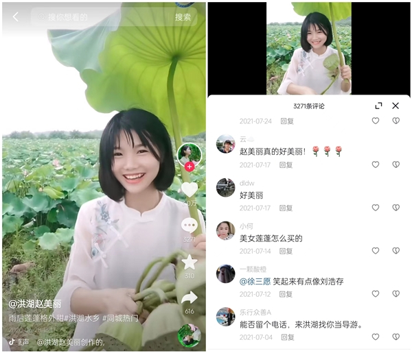 但是摆在愿景面前的,是现实的掣肘。“最开始的半年,一点希望都看不到。”有一次直播持续了半天也只有几十个人观看。转机发生在一个雨天。在荷塘里的一次拍摄中,天空突然下起了大雨,赵美丽像小时候那样擎着荷叶遮雨,对着镜头介绍雨后的莲子格外好吃。没想到,这个短视频“爆了”,光是点赞就达上万。一些网友们感慨,很久没有看到这种在藕塘里肆意大笑,无忧无虑的画面了。