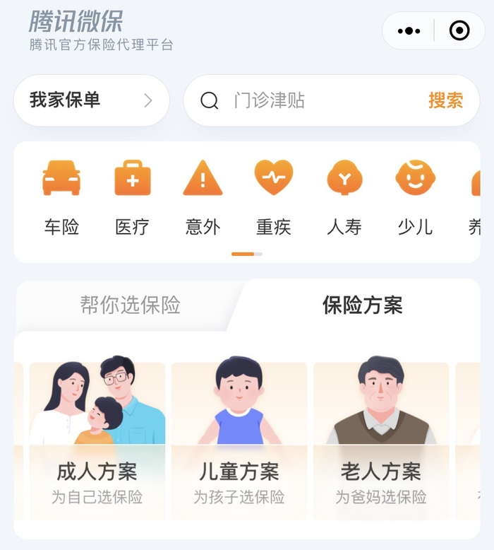 腾讯微保小程序首页上线开发了“我家保单”、“帮你选保险”、“保险方案”等工具,让用户更容易理解究竟何为“保险规划”以及如何进行个人及家庭“保险规划”。