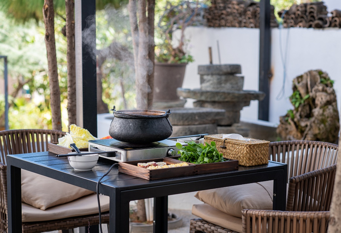 还有当地村民家养土鸡用石锅炖制两小时以上的土鸡火锅,加入羊肚菌及应季新鲜蔬菜,鸡肉在菌子的加持下鲜味翻倍,享用时先喝汤再吃鸡后涮菜,用美食治愈所有不开心。除此之外,还能品尝到手工苦荞粑粑、用十几种大理本地特色秘制调料和新鲜猪肉熬制的云南杂酱米线,真正的本地特色美食才能在细微处放大幸福。