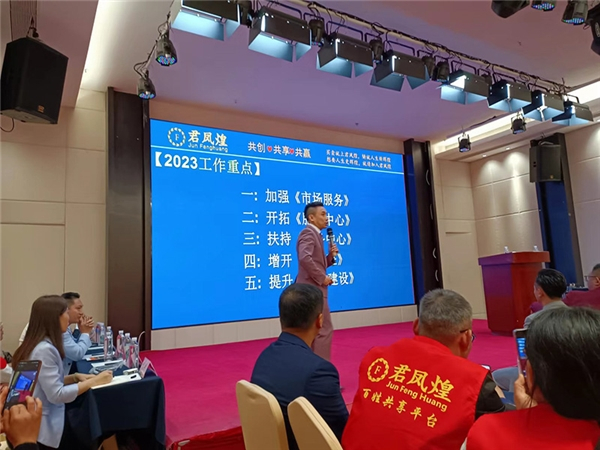 本次会议由君凤煌市场部华东区总监罗义平先生主持,罗总主持落落大方激情四溢诙谐幽默,将会议推向一波又一波的高潮。凤煌集团董事长王德君先生首先做了会议报告,王董在报告中介绍:转眼间君凤煌已进入了第四个年头,三年多来,公司从无到有,我们细致经营,公司茁壮成长,到如今五千多万用户、三十几万商家、八百多个服务网点、五百多个社区服务员遍布祖国的大江南北。特别是在2022年公司进入快递发展时期,公司突破了疫情,经历过严峻的考验,终究凤凰涅槃重新翱翔。我们获得了政府部门的支持,成功并入国企控股,在加拿大多伦多上市,成立致富三农振兴乡村,收购文化产业艺起梦,升级成为集团公司,为未来更广阔、更深远发展做好坚实的基础。