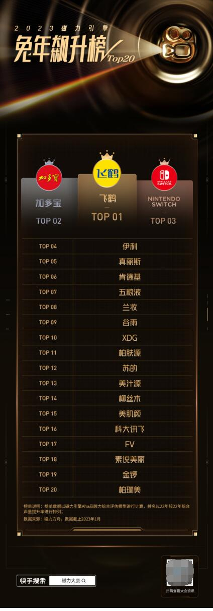 事实上,已有不少品牌成功应用Aha模型实现经营提效:某传统汽车品牌基于Aha指数发现平台内声量与行业头部品牌有较大差距,且用户互动热情及搜索意愿较低,于是借势快手平台年末大型CNY项目影响力扩大曝光,同时定制低门槛、增好感的春节互动活动提升用户兴趣,最终该品牌的Aha模型中触达声量指数提升368%、互动声量指数提升163%。本次磁力大会上发布的“磁力引擎年度影响力品牌榜”,则包含了服饰鞋靴、3C、家电、食品饮料、汽车、美妆、母婴7个行业的2022年度TOP20榜单,以及1个兔年飙升TOP20榜单。