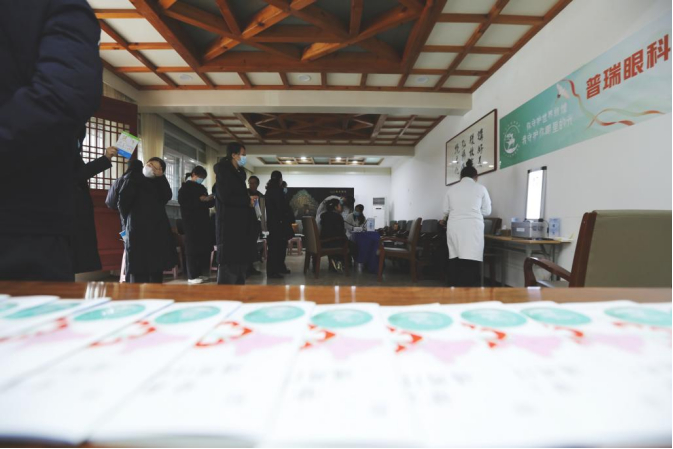 麦积山石窟艺术研究所内,工作人员热情接待了我们,在安排好的体检场地组织员工及家属检查眼睛,大家掩饰不住的期待和信任,让志愿者一扫路途的疲劳立即着手工作。医务人员悉心为每一位工作人员及家属测视力、查眼底,对罹患白内障、高度近视、干眼、眼底病的人员,均做治疗及防护建议并耐心解答眼病疑问。