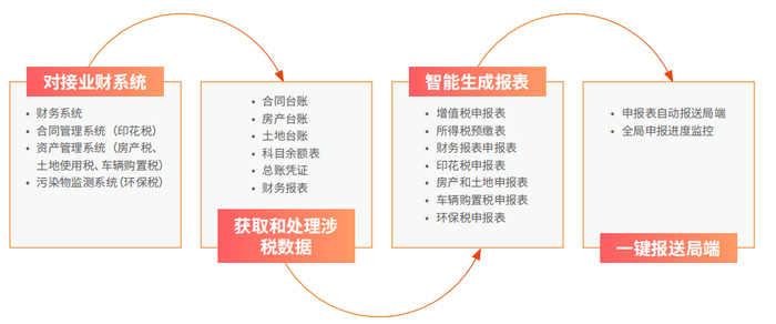 用友建筑税务风险管理解决方案实现业财税一体化联动,建筑企业可实时对接业财系统,智能取数,设置计税规则,自动计税,生成申报表,并连接税局端的电子税务局,通过直联接口或者RPA财税机器人完成智能申报,有效降低企业的税务测算风险。