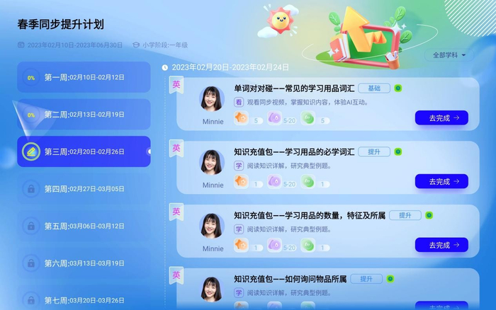 同时,为了减轻家长的辅导压力,学习规划师为孩子们精心布局了全年学习计划。最新开启的春季同步提升计划已全面上线,分为周中夯实同步、期中复习提升、期末提分冲刺三个阶段,帮助孩子总结知识体系,查漏补缺。让孩子一步一脚印地打好学习基础,高效且稳扎稳打地提升。