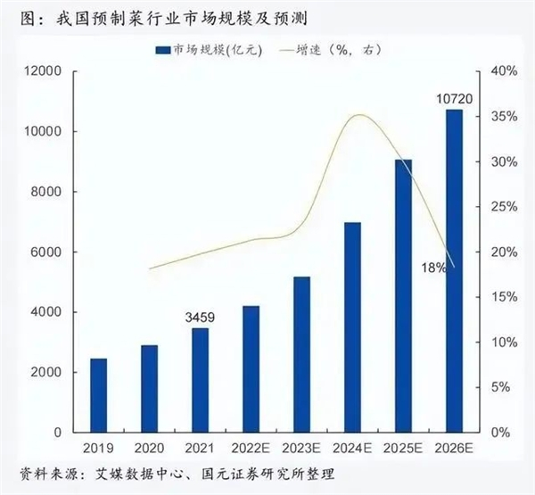 据艾媒数据显示,2021年中国预制菜市场规模为3459亿元,2022年预制菜全行业产值已经超过4000亿元,同比增长19.8%,预计未来中国预制菜市场持续保持较高的增长速度,2026年预制菜市场规模将达10720亿元。