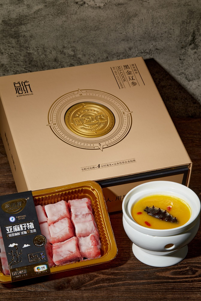 海参作为古往今来高档筵席的代表,往往扮演着“压轴”的角色。此次品鉴会上,“薏仁金汤扣辽参”这道菜品就是由小米、薏米搭配道地辽参熬制而成,高汤特别选用家佳康亚麻籽猪肉来吊汤。辽参则甄选同仁堂健康总统牌黑金辽参,享有国家地理标志认证,4小时即可快速泡发。再辅以小米、薏米成菜,在浓香金汤的融合下,丝丝入扣,鲜咸醇香,口感软糯,每一口都是海与陆的味蕾碰撞。