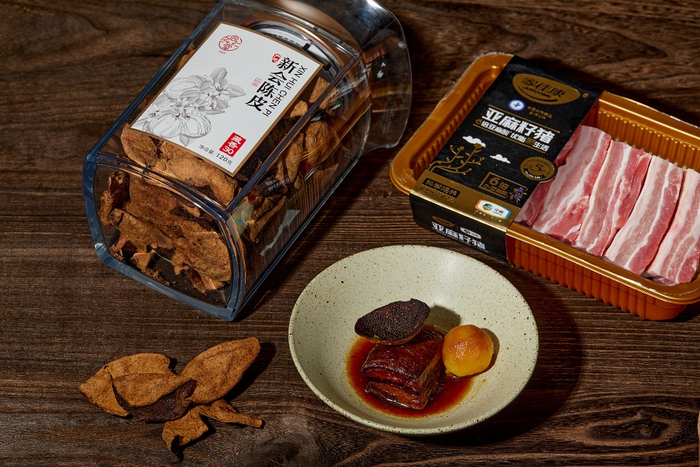 全场备受嘉宾好评的一道主菜“乌梅陈皮东坡肉”,其主料选用的是家佳康亚麻籽猪五花肉,丰富的α-亚麻酸促使亚麻籽猪的脂肪分子排列松散,所以吃起来口感弹嫩,香而不腻,做起来烹饪易熟。这道菜品借鉴经典名菜东坡肉的做法,在烹制过程中配以同仁堂健康草本原料陈皮及乌梅,制作出来的东坡肉色泽酱红明艳,酥烂而形不碎,香糯而不腻口,是一道创意融合的美味佳肴。