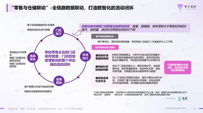 报告指出,智能化不仅仅是概念,更是深入仓储作业流程到业务体系的纵深。零售企业的商品库存管理和门店货架管理,驱动着整个供应链的流动闭环。做好供应链的柔性库存履约能力,智能补货尤为关键。智能补货通过算法整合历史数据,预测精准销量,提高补货精准度,大幅提升决策和执行效率,降低用工门槛和成本,并实现零售前端与仓储后端物流和商流的贯通。