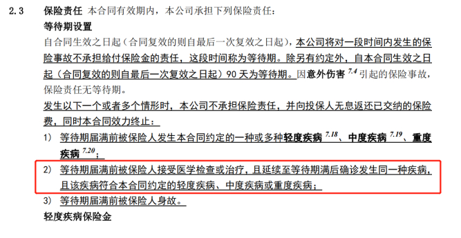 案涉保险合同2.3条对等待期做了解释且约定了等待期内不承担责任的具体情况,该部分还同时约定了若存在“2.3.2等待期届满前被保险人接受医学检查或治疗,且延续至等待期满后确诊发生同一种疾病,且该疾病符合本合同约定的轻度疾病、中度疾病或重度疾病”等情形时,保险公司亦不承担保险责任,并向投保人无息返还已交纳的保险费,同时本合同效力终止。