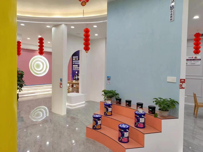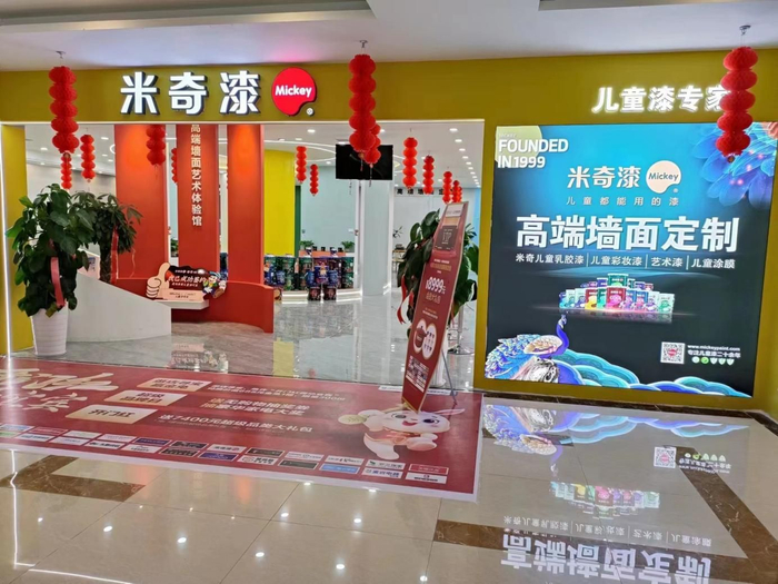 米奇儿童漆李总: 我从2019年10月开始代理米奇儿童漆,当时第一个米奇儿童漆店开在红星美凯龙外馆,店面面积是120㎡。得益于企业的帮扶和产品的优势,当时生意特别好。趁热打铁,在2020年,接着开了第二家米奇儿童漆专卖店,店面面积更大,是240㎡。现在这家店是我开的第三家米奇儿童漆旗舰店,店面面积360㎡,店面形象沿用了企业的最新设计方案,店内展示米奇漆内墙全体系产品。