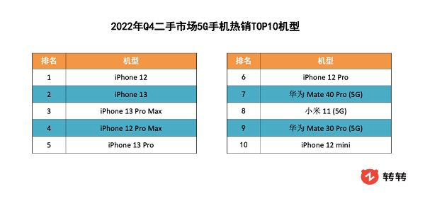 与此同时,在二手市场上,5G iPhone的市场热度也在不断提升。根据转转集团发布的手机行情报告显示,2022年,各季度5G手机交易量Top10机型榜单上,iPhone的上榜数量占比均过半。其中,单季最少上榜5款机型,Q2和Q4上榜机型数量最多,达到7款。