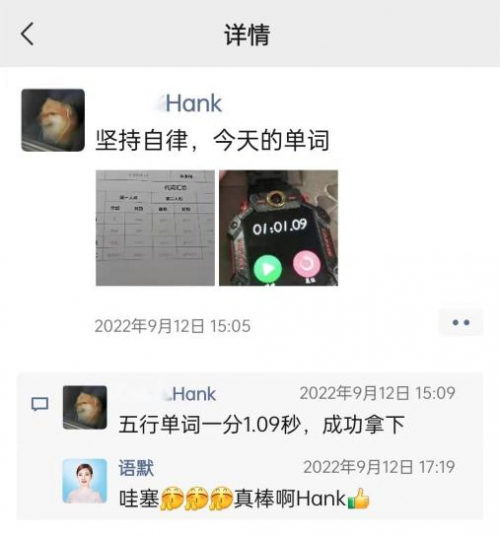 “咱们约定好,如果你能坚持一个月,我们都给你一个小礼物好不好。”牟奕同老师的这句话,成了Hank挑战自己的动力。从那天开始,每天他都会将自己的打卡内容发到朋友圈,老师们看到后,会给他点赞和鼓励。