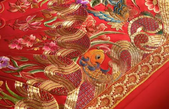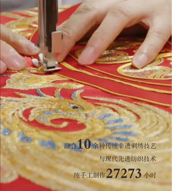 扒锦的绣线采用了玫瑰坊特定的彩金线。彩金线原是日本的纺织纤维线,玫瑰坊通过技术研究用于刺绣,但因其牢固度不强,刺绣时七针断线,刺绣难度很高。刺绣匠人必须在第七针断线前剪断,再重新纫针,以免断在织物中。传统刺绣技艺与现代先进纺织技术的融合,历经27273小时才成就了这款百万艺术级寝品的诞生。