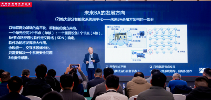 会上,上海大学赵哲身教授首先带来主题分享。赵教授指出,传统BA存在的普遍痛点亟待解决,例如BA组态过于复杂、控制回路PID依赖高级工程师、传感器数据不准和期望寿命不长——能自整定传感器,自动补偿传感值、常驻应用程序没有有效使用等,并对中国楼宇自控企业针对这些挑战,在产品规划中的芯片、操作系统、通讯协议等方面的探索进行了综合对比。除此之外,赵教授还就未来楼宇自控的魔方架构、物联网化、群智能、SDN软件定义网络等趋势与所有美控经销商进行了分享,并进一步肯定了美控在技术趋势判断。他表示,美的在智慧楼宇、暖通科技方面经验丰富,美的研发制造体系对于美控产品加持方面拥有巨大优势。