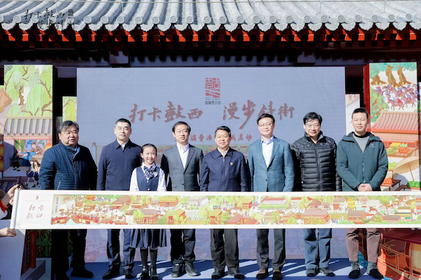 活动现场,北京市文物局局长陈名杰,西城区委副书记、区长刘东伟,副区长桑硼飞,北京银行北京分行行长唐一鸣,鼓西企业代表天恒置业集团党委书记、董事长刘戍东,蓟城山水集团党委书记、董事长高俊宏,鼓西居民代表林子峰,鼓西商户代表惟音艺术少儿合唱团儿童冯靖雯小朋友等共同为《海畔高街 古韵新象》鼓西长卷盖章,启动“打卡鼓西 漫步斜街”文化消费活动项目。
