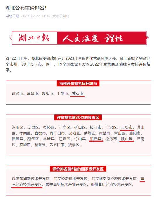 目前,黄石营商环境成功进入全国综合评价50强;2023年2月,黄石获评湖北省营商环境“标杆城市”,下辖大冶市、阳新县、铁山区入列全省县(市区)营商环境评价排名前30位。作为“全国百强县市”的大冶市,还蝉联全国文明城市,是中国宜居宜业城市,连续多年获评“中国营商环境百佳示范县市”。2022年,大冶全国百强排名进位至第67位,成为全国进位最多的百强县。2023年,大冶全面吹响了全面冲刺千亿县市,奋进全国县域经济50强的冲锋号角,加快构建新能源和智能网联汽车、生命健康、新材料、高端智能制造、电子信息、临空六大产业集群。