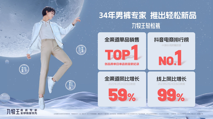 2月24日晚,男裤专家九牧王携手轻松裤推荐官黄圣依女士,于抖音官方直播间举办九牧王轻松裤发布会,当场直播取得全渠道单品销售TOP1的成绩,创品牌单日单品销量新纪录,抖音电商榜中弹休闲裤爆款榜NO.1,2月24日当天全渠道同比增长59%、线上同比增长99%。九牧王轻松裤已于2月24日在各大电商平台及线下门店全面上市,可前往关注购买。