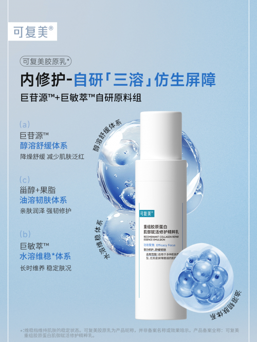 可复美胶原乳内含专研「双仿生」屏障修护体系:外强韧仿生屏障体系包含C5HR重组胶原蛋白仿生组合与神经酰胺脂质体系;内修护仿生屏障体系包含自研原料组巨苷源™醇溶舒缓体系、巨敏萃™水溶维稳体系和甾醇+果脂油溶韧肤体系。整个成分配方体系不添加香精、色素、防腐剂等刺激性成分,拒绝单一浓度的堆砌,以科学配方与专研原料组应对各种场景下的皮肤屏障问题。