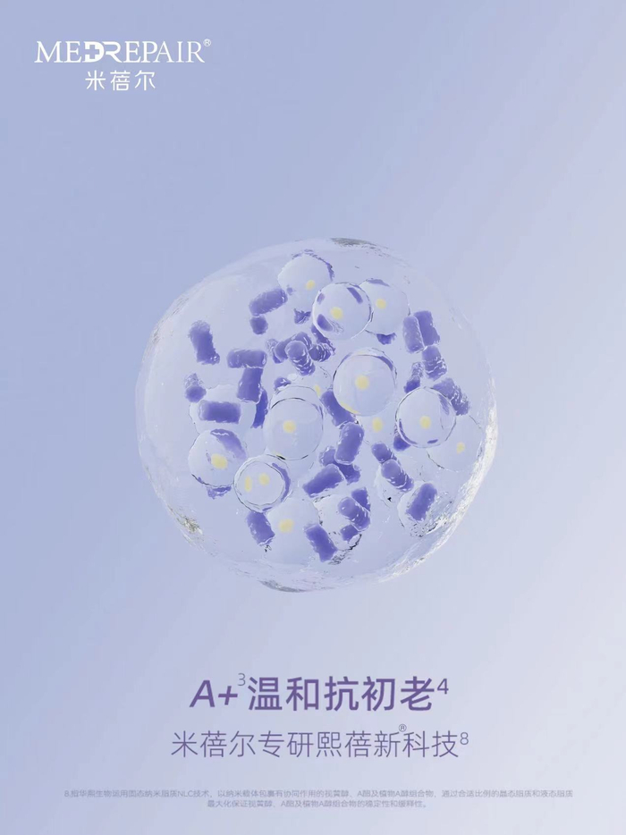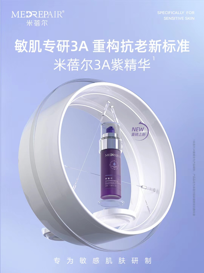 围绕前文提到的敏肌抗老消费特征及趋势,米蓓尔已经在产品开发层面有了实质性进展。比如,2023中国敏感肌肤抗老趋势论坛现场发布的新品米蓓尔“3A紫精华”(MedRepair米蓓尔轻龄紧致新肌精华液),便是紧跟以上趋势的技术产物。